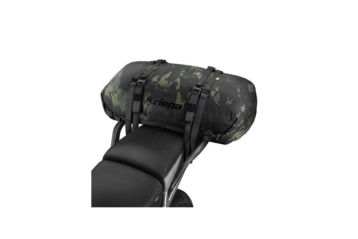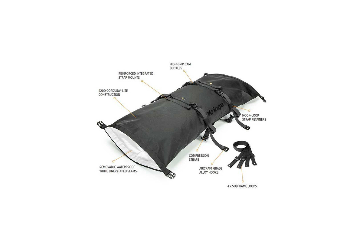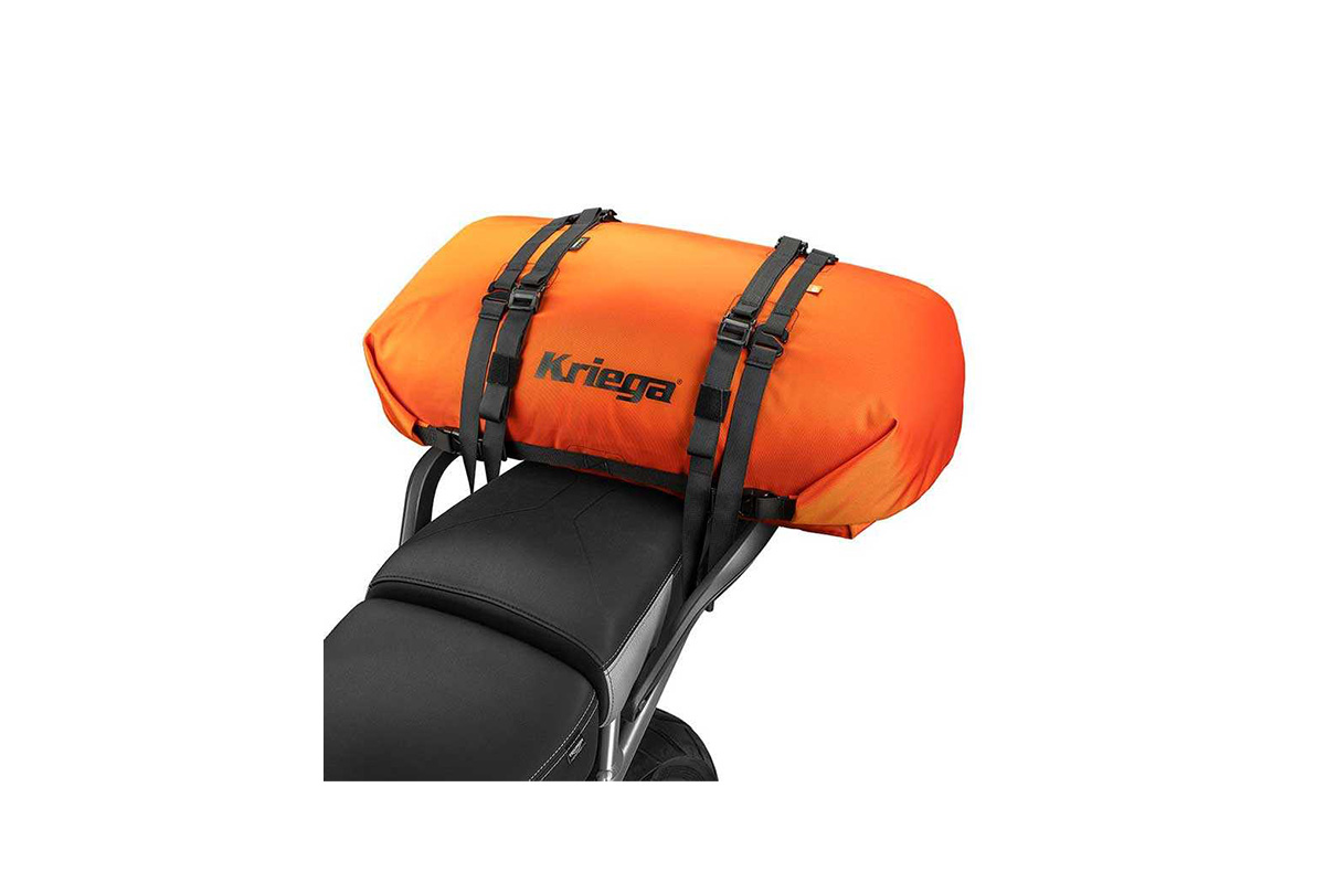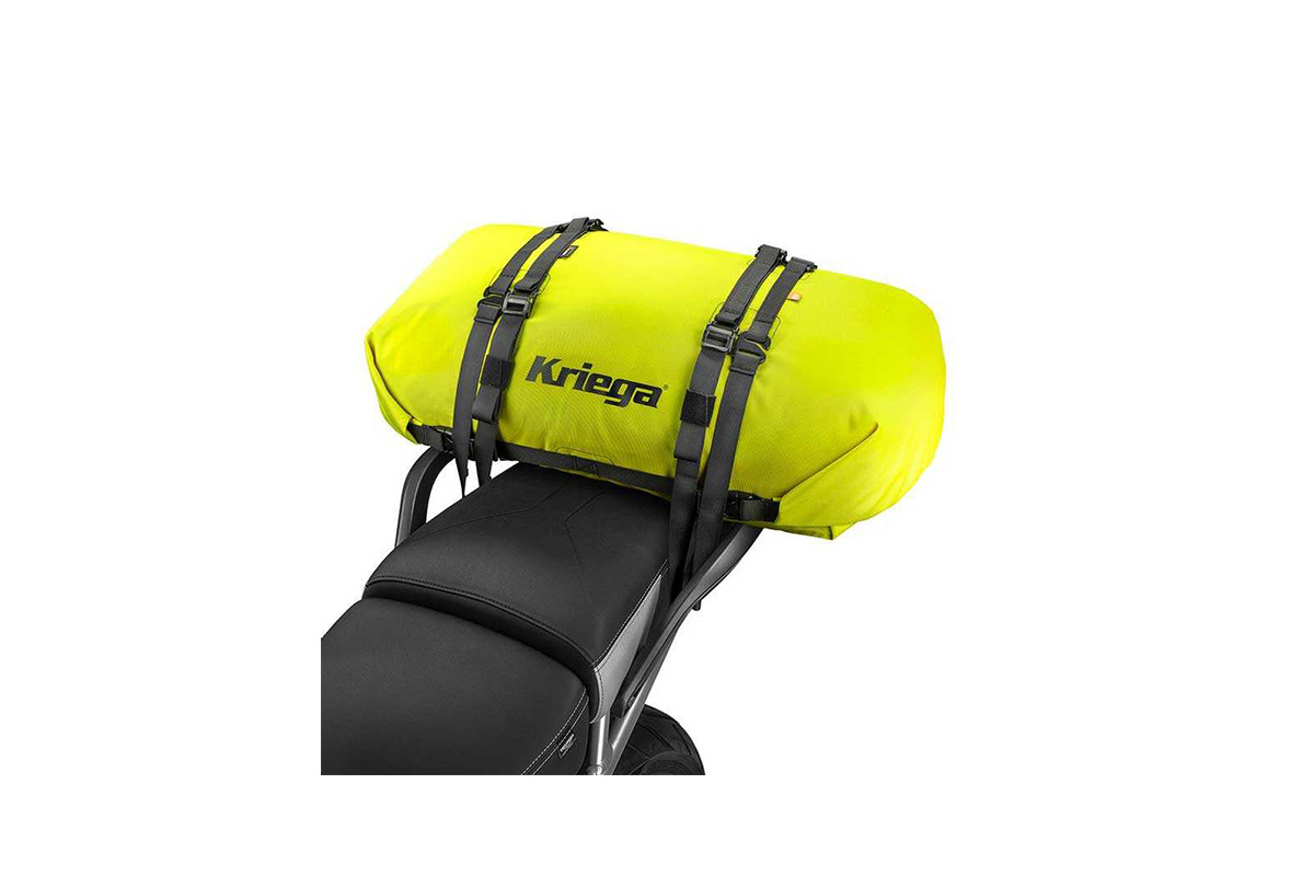 ROLLPACK, bir arka rafa veya arka koltuğa güvenli bir şekilde oturacak şekilde tasarlanmıştır ve fazladan depolamaya ihtiyaç duyduğunuzda rulo haline getirilebilir ve motosiklet üzerinde veya bir sırt çantasında taşıyabilirsiniz.